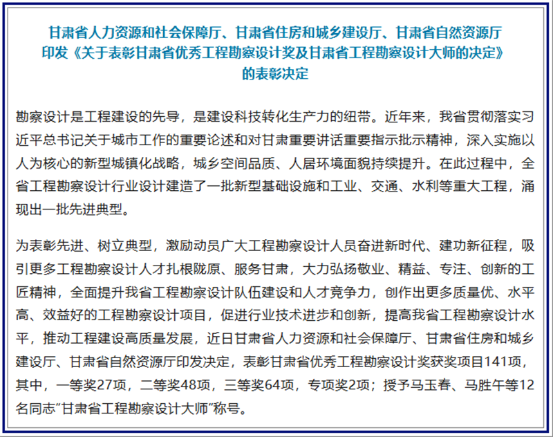 5月中旬,省人力資源和社會保障廳、省住房和城鄉(xiāng)建設廳、省自然資源廳印發(fā)《關于表彰甘肅省優(yōu)秀工程勘察設計獎及甘肅省工程勘察設計大師的決定》,甘肅工程咨詢集團38項勘察設計項目(作品)獲“甘肅省優(yōu)秀工程勘察設計獎”,其中一等獎9項,二等獎16項,三等獎13項;毛明強、李中輝、張嶺峻獲“甘肅省工程勘察設計大師”稱號。