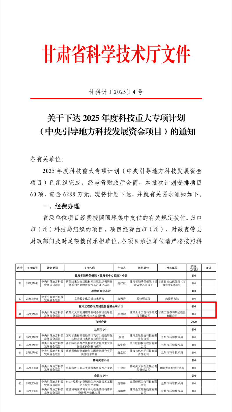 近日,甘肅省科技廳公布了2025年度科技重大專項(xiàng)計(jì)劃(中央引導(dǎo)地方科技發(fā)展資金項(xiàng)目)立項(xiàng)名單,甘肅工程咨詢集團(tuán)土木工程院主持申報(bào)的“資源化大宗利用煤矸石制備高活性綠色低碳膠凝材料技術(shù)成果轉(zhuǎn)化”項(xiàng)目成功立項(xiàng)。