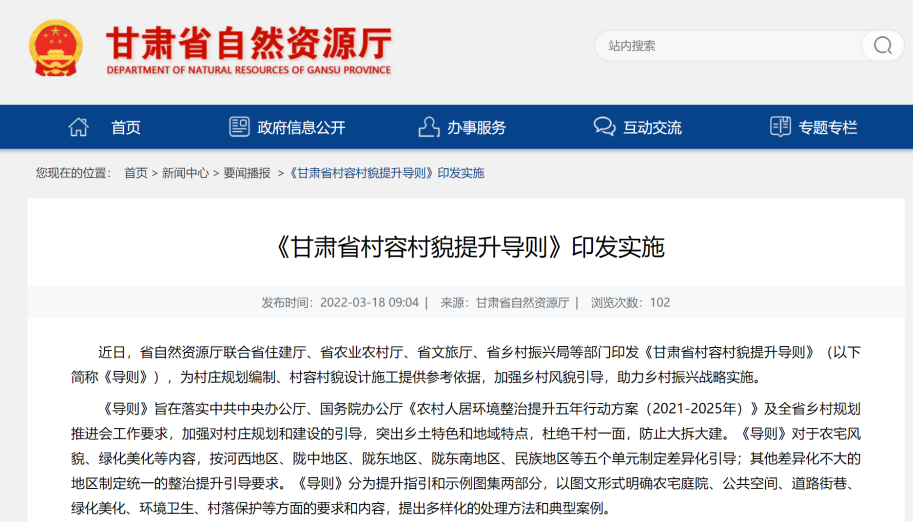 為進(jìn)一步貫徹落實(shí)中共中央辦公廳、國務(wù)院辦公廳《農(nóng)村人居環(huán)境整治提升五年行動方案(2021—2025年)》及全省鄉(xiāng)村規(guī)劃推進(jìn)會精神,由甘肅省城鄉(xiāng)規(guī)劃設(shè)計(jì)研究院有限公司牽頭,聯(lián)合甘肅省建筑設(shè)計(jì)研究院有限公司、西北師范大學(xué)城市規(guī)劃與旅游景觀設(shè)計(jì)研究院編制的《甘肅省村容村貌提升導(dǎo)則(試行)》(以下簡稱《導(dǎo)則》),于3月18日由省自然資源廳、省住建廳、省農(nóng)業(yè)農(nóng)村廳、省文旅廳、省鄉(xiāng)村振興局等五部門聯(lián)合印發(fā)。《導(dǎo)則》的發(fā)布為全省村莊規(guī)劃編制工作提供了參考依據(jù),是推進(jìn)鄉(xiāng)村振興戰(zhàn)略實(shí)施的重要抓手,是改善我省農(nóng)村人居環(huán)境、建設(shè)美麗甘肅的核心引導(dǎo),將在規(guī)范我省村容村貌提升、弘揚(yáng)傳統(tǒng)文化、突出鄉(xiāng)土特色和地域特點(diǎn),杜絕千村一面,防止大拆大建等方面發(fā)揮重要作用。