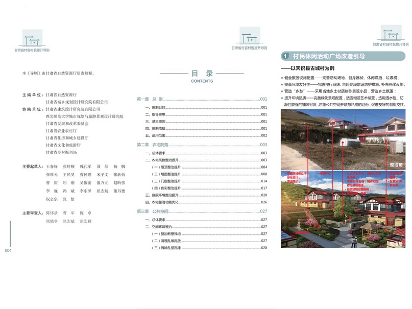 《導(dǎo)則》成果分為提升指引和示例圖集兩部分。提升指引部分以文字形式明確了甘肅省村容村貌整治提升的要求和內(nèi)容,包括總則、農(nóng)宅院落、公共空間、道路街巷、綠化美化、環(huán)境衛(wèi)生、村落保護(hù)、保障機(jī)制和附錄等9個章節(jié),對全省5個國家級歷史文化名村和54個傳統(tǒng)村落實(shí)行特殊保護(hù);示例圖集部分以圖文形式提出了村容村貌提升的多種、可選處理方法和典型案例,主要包括農(nóng)宅院落、公共空間、道路街巷、綠化美化、環(huán)境衛(wèi)生、村落保護(hù)等6部分內(nèi)容。