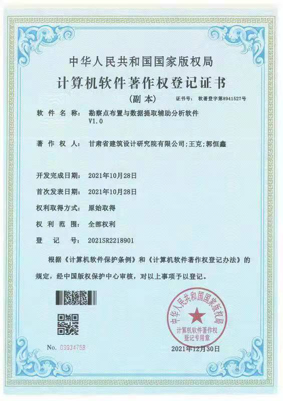 近日,從國家版權(quán)局傳來好消息,根據(jù)《計算機軟件保護條例》《計算機軟件著作權(quán)登記辦法》規(guī)定,甘肅省建筑設(shè)計研究院有限公司工程勘察院研發(fā)的“勘察點布置與數(shù)據(jù)提取輔助分析軟件”,經(jīng)專家審核,授予計算機軟件著作權(quán)登記證書。