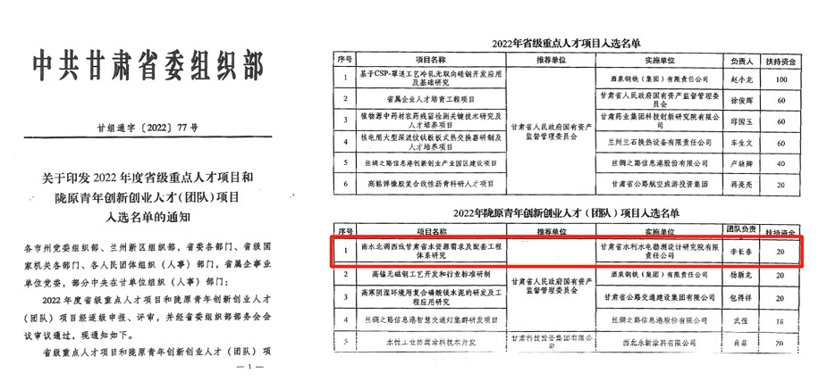近日,省委組織部印發(fā)了《2022年度省級重點人才項目和隴原青年創(chuàng)新創(chuàng)業(yè)人才(團隊)項目入選名單》,甘肅省水利水電勘測設計研究院有限責任公司申報的《南水北調西線甘肅省水資源需求及配套工程體系研究》成功入選“2022年隴原青年創(chuàng)新創(chuàng)業(yè)人才(團隊)項目”,是集團公司唯一入選項目。