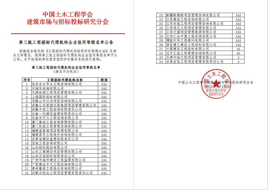 為認(rèn)真貫徹落實(shí)甘肅省第十四次黨代會(huì)精神,更好地發(fā)展招標(biāo)代理業(yè)務(wù),努力推進(jìn)企業(yè)高質(zhì)量發(fā)展,2022年6月,甘肅省建設(shè)監(jiān)理有限責(zé)任公司積極籌備參加了由中國土木工程學(xué)會(huì)建筑市場與招投標(biāo)研究分會(huì)組織的招標(biāo)代理機(jī)構(gòu)信用評價(jià),日前,第三批工程招標(biāo)代理機(jī)構(gòu)企業(yè)信用等級(jí)名單公布,建設(shè)監(jiān)理公司榮獲中國土木工程學(xué)會(huì)建筑市場與招標(biāo)投標(biāo)研究分會(huì)招標(biāo)代理機(jī)構(gòu)AAA級(jí)信用企業(yè)稱號(hào)。