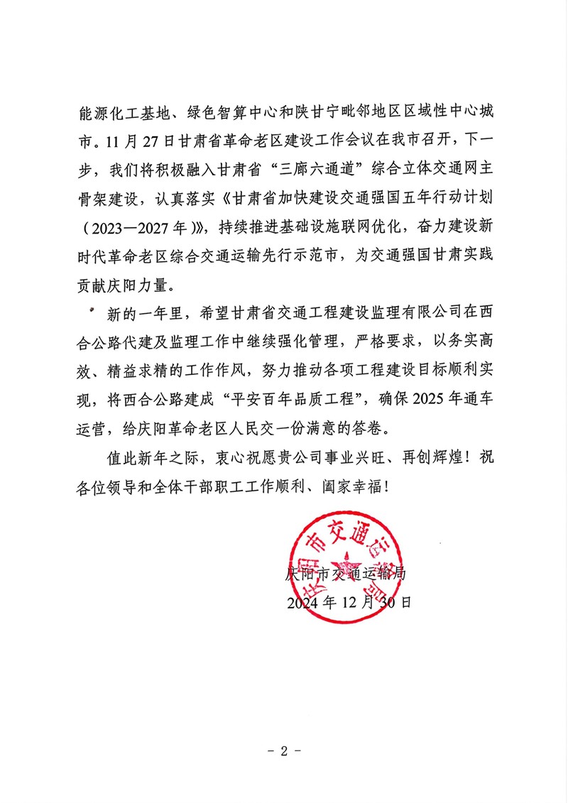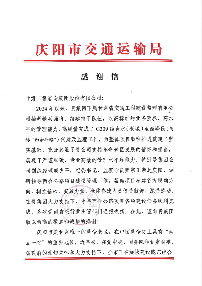 慶陽市交通運輸局向甘肅工程咨詢集團發(fā)來感謝信