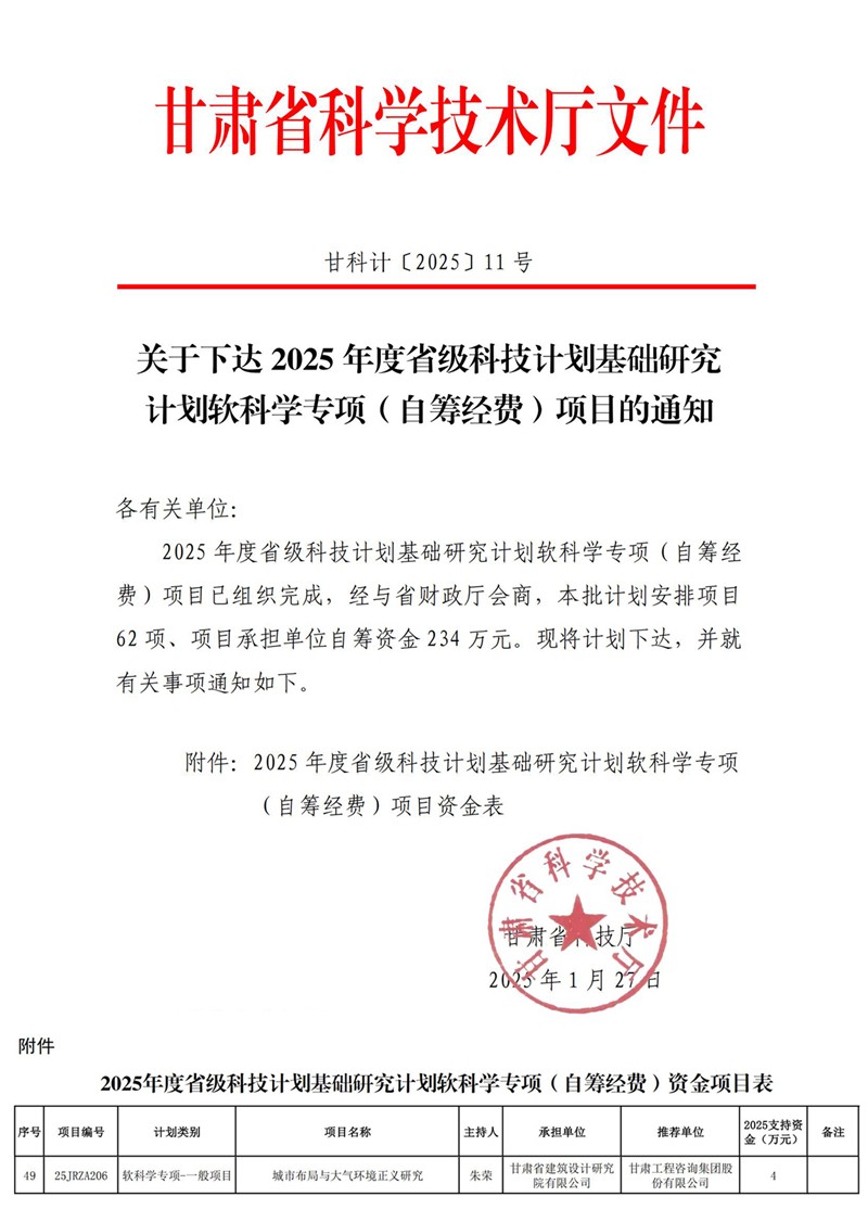 近日,甘肅省科技廳公布了2025年省級科技計劃基礎研究計劃軟科學專項(自籌經費)項目立項結果,省建筑設計院申報的“城市布局與大氣環(huán)境正義研究”項目獲批立項。